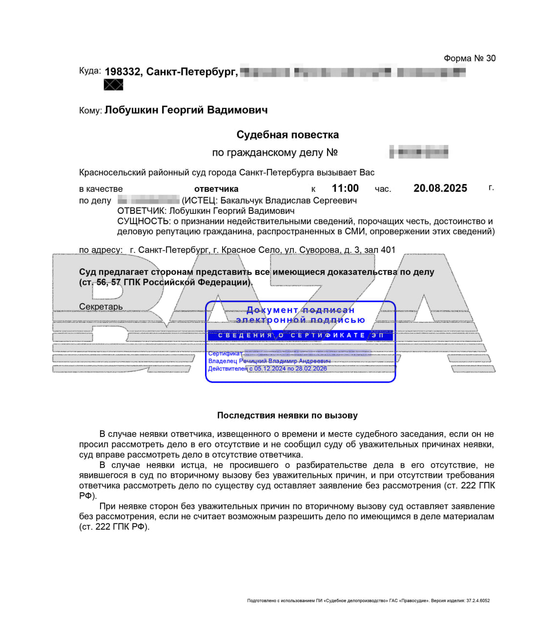 По данным «Базы», судебная повестка была отправлена экс-пресс-секретарю «ВК» Лобушкину через «Госуслуги». В документе не отражены конкретные причины для иска, однако в сущности дела указано, что речь идёт о «признании недействительными сведений, порочащих честь, достоинство и деловую репутацию Бакальчука», которые ответчик якобы распространял в медиа.