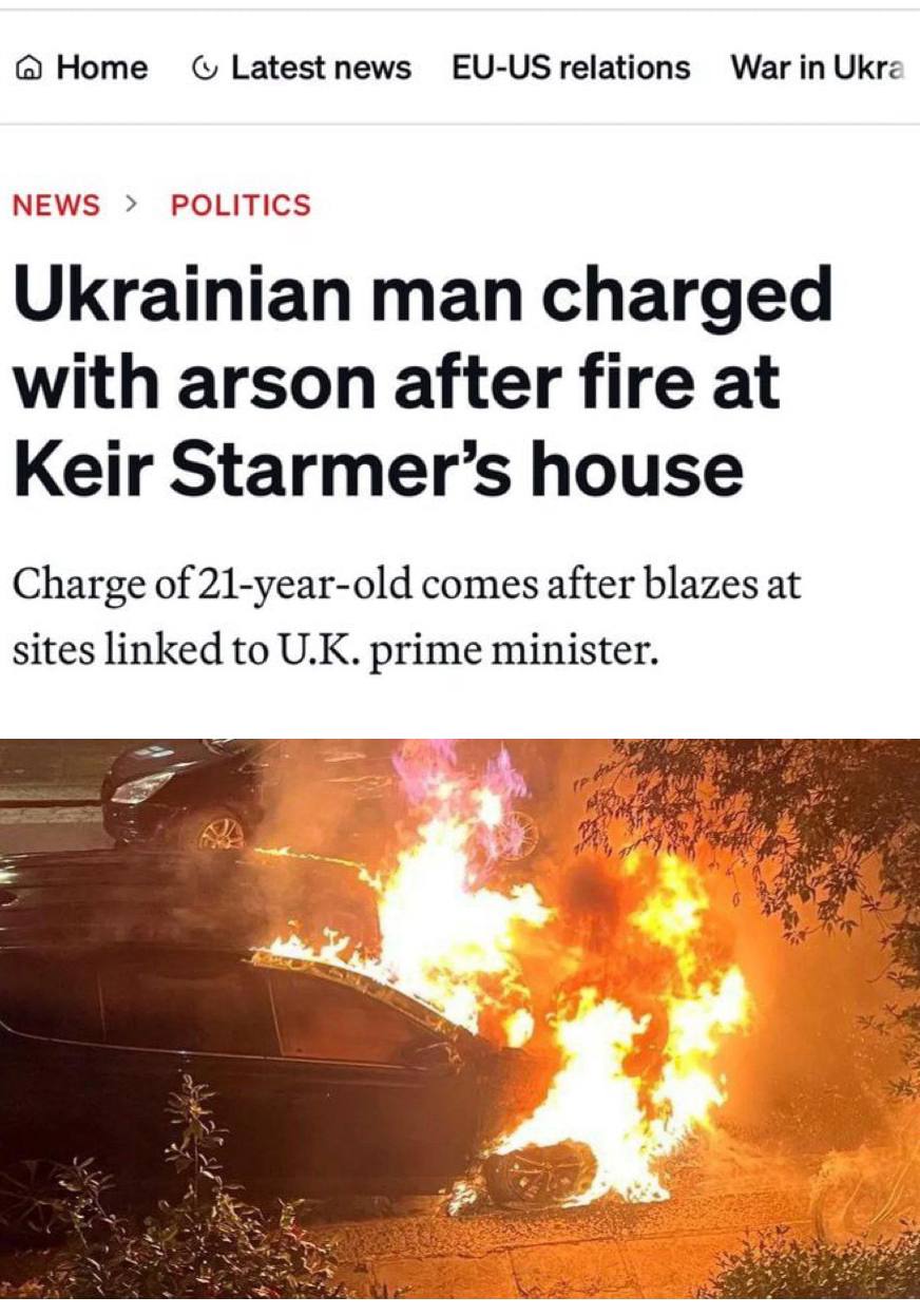 Какой-то хохол по фамилии Лавринович поджег машину и дом, принадлежащие премьеру Стармеру.