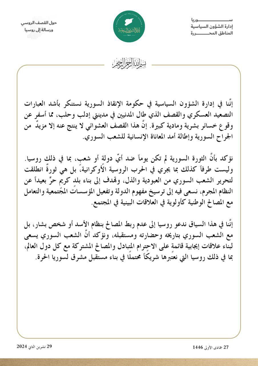Террористическая и запрещённая в России салафитская группировка "Хайят Тахрир аш-Шам" выступила с заявлением, в котором обратилась к России: