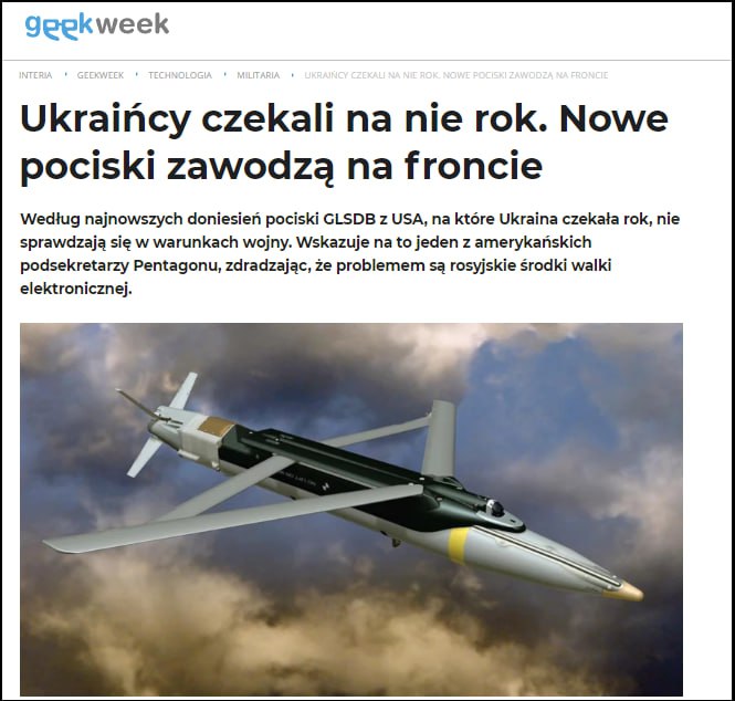 Польский информационный портал Interia: американские бомбы наземного базирования GLSDB (Ground Launched Small Diameter Bomb), которых Киев ждал больше года, оказались абсолютно бесполезны в условиях работы российских средств РЭБ. Последние успешно подавляют GPS-навигацию, которую используют GLSDB.