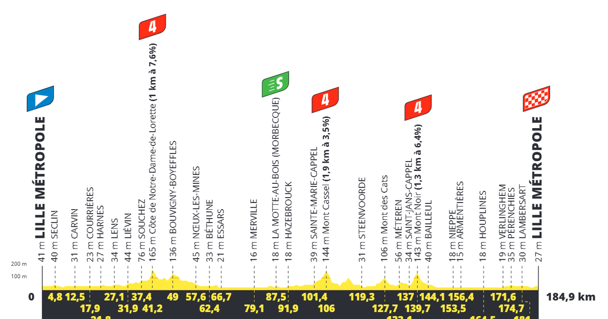 La 112e édition du Tour de France démarre de Lille avec un parcours de 185 km qui devrait permettre à coup sûr aux sprinteurs de rafler la mise. Le premier vainqueur empochera aussi le maillot jaune. Il faut donc s’attendre à une première journée très nerveuse dans le peloton qui ne laissera sans doute aucune chance aux tentatives d’échappées. Les petites difficultés du jour, Mons des Flandres, Mont Cassel et Mont Noir permettront aussi de désigner le premier porteur du maillot à pois. Le final de l’étape se déroulera sur une ligne droite d’un kilomètre. Les cuisses vont chauffer pour aller chercher la victoire d’étape !