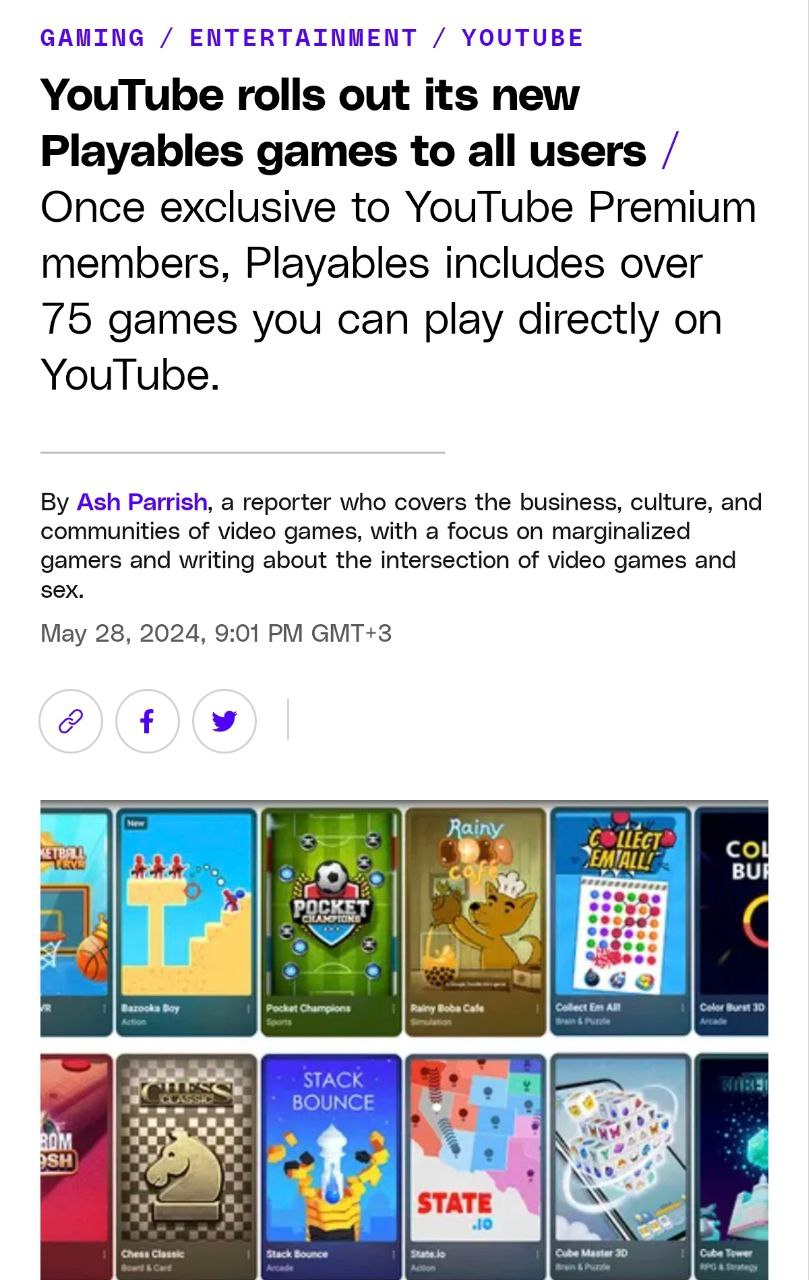 YouTube открыл 75+ игр для всех пользователей: раньше раздел Playables на ПК и мобильных девайсах был доступен лишь Premium-пользователям.