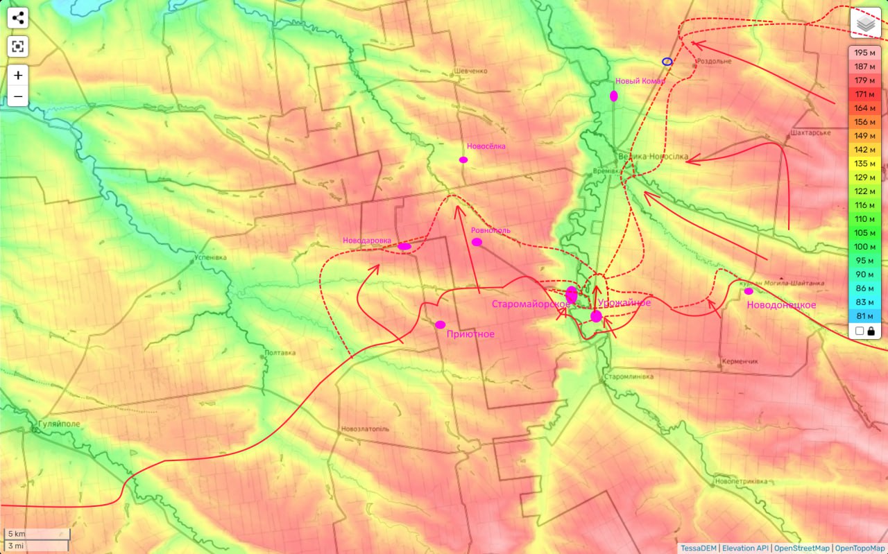 Также мы медленно движемся в сторону н.п. Разлив и пробуем прорвать оборону ВСУ между Новодаровкой и Ровнополем. Здесь пока только тактические успехи.