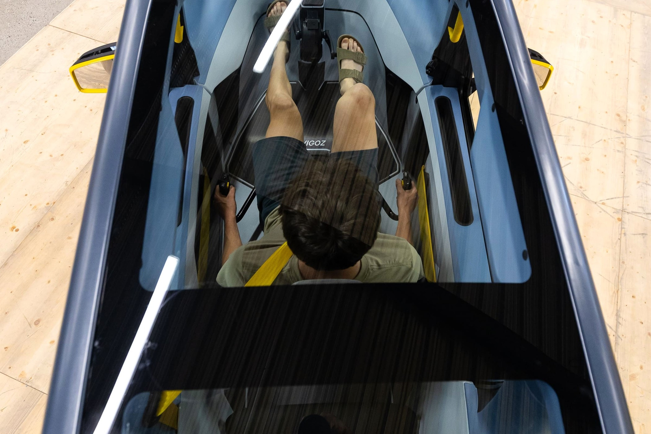 Запас хода на одной зарядке — примерно 160 км, точная цифра будет зависеть в том числе от того, как часто и с каким усилием водитель будет крутить педали. Усилие можно регулировать, так что каждый ездок сможет выбрать комфортную нагрузку. Руль похож на велосипедный и проходит буквально под пятой точкой пилота. Для аварийного тормоза предусмотрена отдельная напольная педаль. Над педальным узлом находятся два приборных экрана. Над лобовым стеклом разместился блок настроечных клавиш и рукояток. В крышу вмонтированы два смотровых окна, обзорность вполне себе аквариумная.