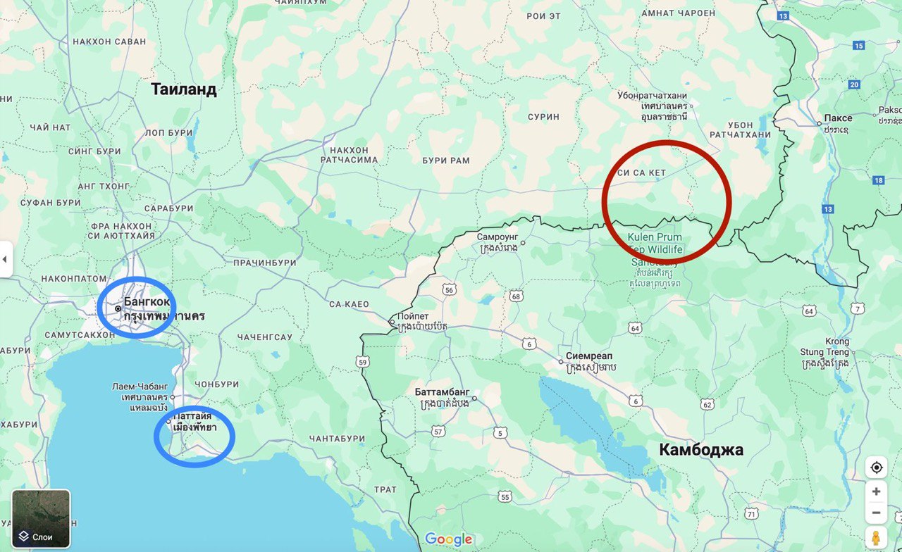 Российский союз туриндустрии показал на карте, что область, где идут столкновения между военными Таиланда и Камбоджи (обведена красным), находится далеко от популярных у туристов мест