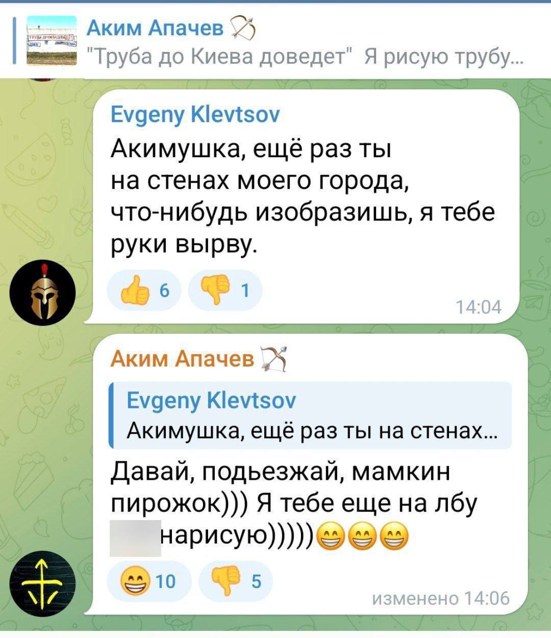 На своём тг-канале Апачев выкатил видос, в котором хвастался, что приехал в освобождённый город, чтобы закрасить оставленные послания всушников. Местные жители, которые увидели ролик порыв не оценили и стали вежливо спрашивать с реперка в комментах. На что получили оскорбления, звонки с угрозами и остальной набор обиженного маэстро.