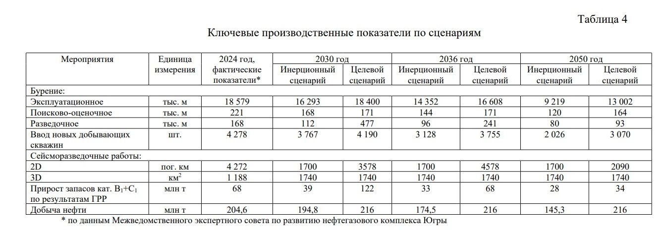 Так, при целевом, приоритетном, сценарии, когда предполагается сохранение региональной доли добычи нефти на уровне 40% от российского уровня за счет увеличения инвестиционной привлекательности отрасли, вложений в геологоразведку, прироста ресурсной базы, к 2030 году добыча нефти должна составить 216 млн тонн. И на этом уровне держаться до 2050 года. При этом ввод скважин и геологоразведочное бурение будет сокращаться.