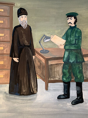 Допрос священномученика Алексия Молчанова. Рисунок Марии Романовой Имя священномученика Алексия Молчанова не забыто ни в Костромской земле, ни в Нижегородской. В Нежитине, в Воскресенском храме, люди молятся у иконы святого земляка. Прихожане знают, что уроженец их села принял мученическую кончину, но сана священнического не посрамил.