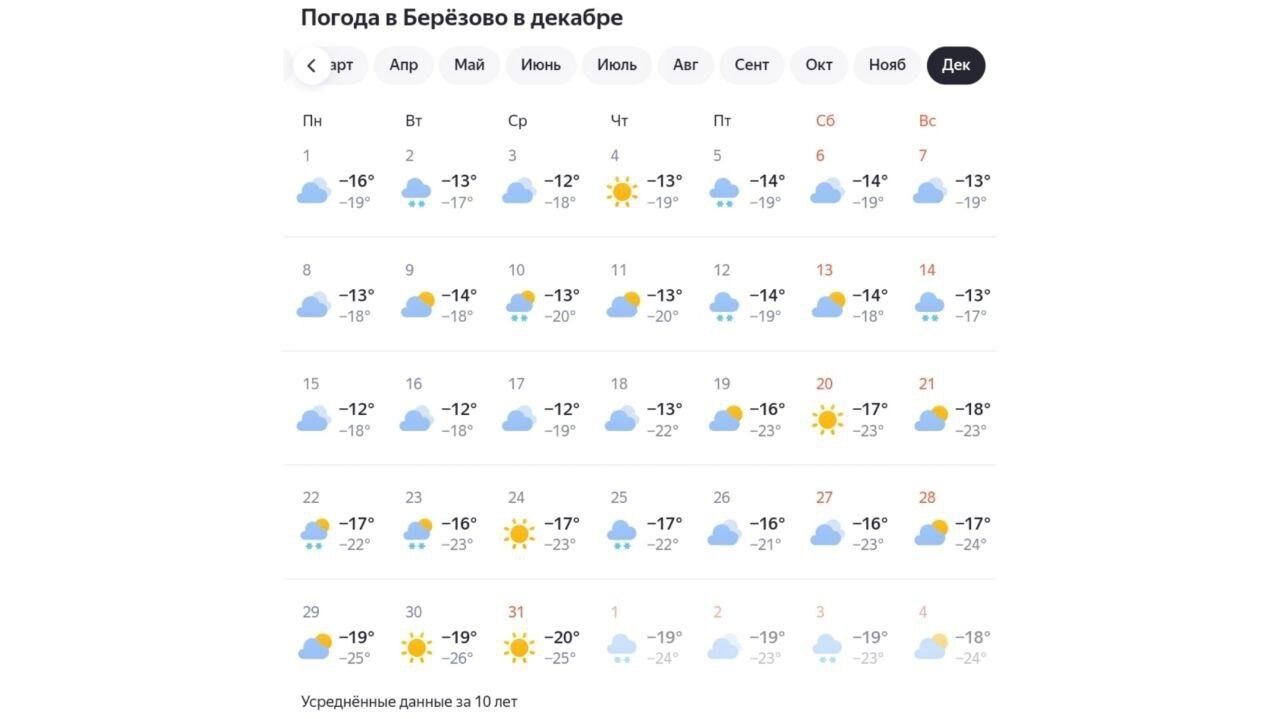 В более южном Ханты-Мансийске, Сургуте и Нижневартовске температуры в целом прогнозируют аналогичные. До середины месяца будет около -14…-13 градусов днем, во второй половине начнет холодать до -19…-18 градусов. Причем максимальный «минус» составит 19 градусов — его обещают только 31 декабря.