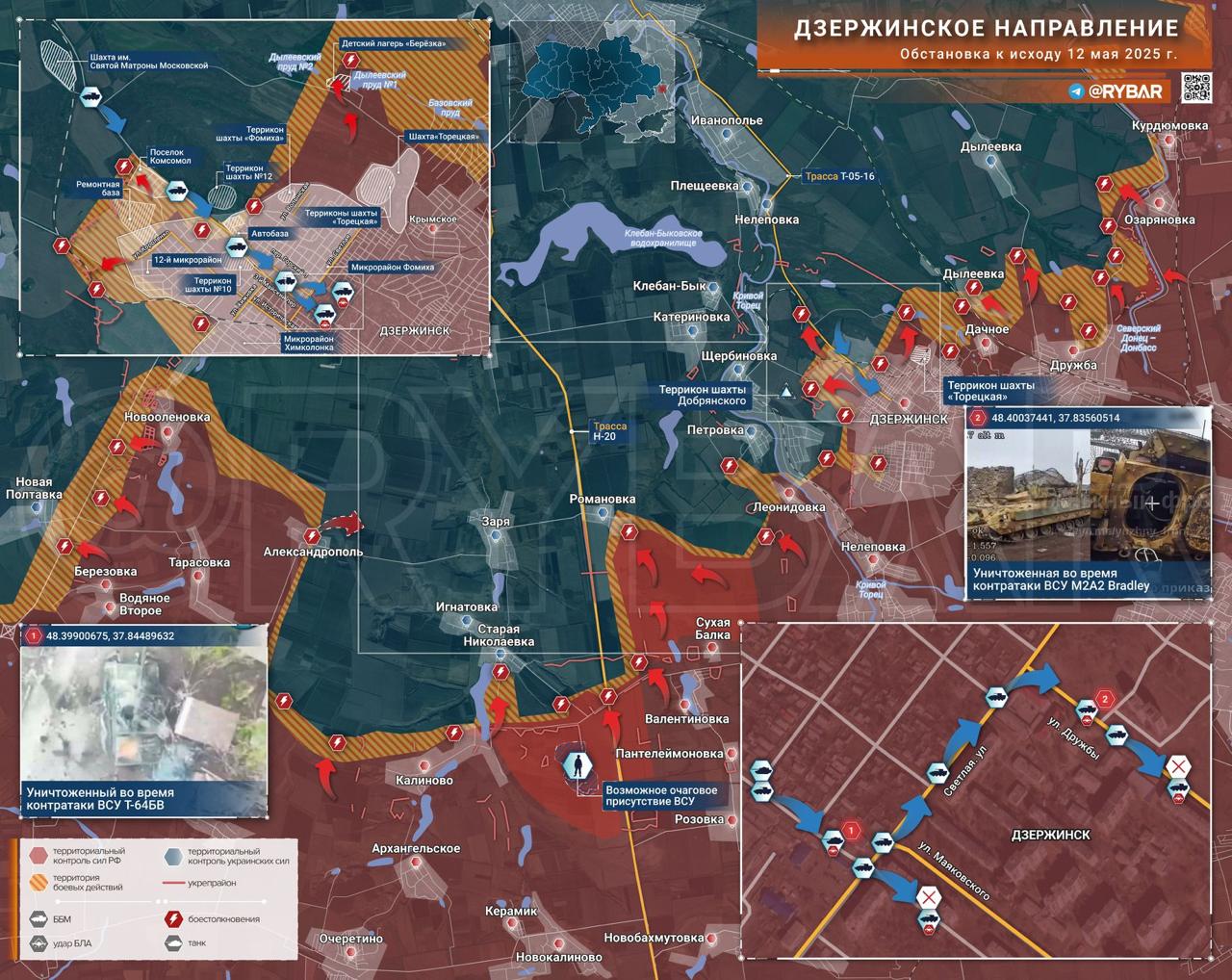 В преддверии Дня Победы украинскими формированиями была предпринята контратака со стороны Нелеповки и Щербиновки по направлению к вновь освобожденному российскими войсками Дзержинску. В ходе данной атаки большой бронегруппе противника с пехотой на борту удалось «залететь» в сам город, а отдельные единицы техники при этом смогли проехать вплоть до центра населённого пункта.