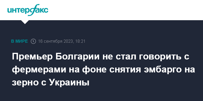 Москва. 16 сентября. INTERFAX.RU - Глава правительства Болгарии Николай Денков отказался от переговоров с сельхозпроизводителями, которые намерены организовать акции протеста против снятия эмбарго на поставки украинских зерновых в страну.