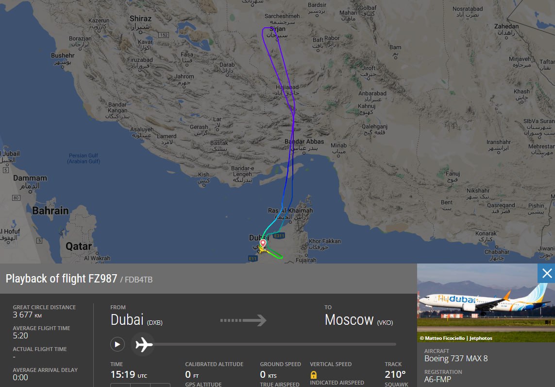 Вероятно, компания решила заменить борт: только что из DXB рейсом FZ987 вылетел уже другой самолёт.