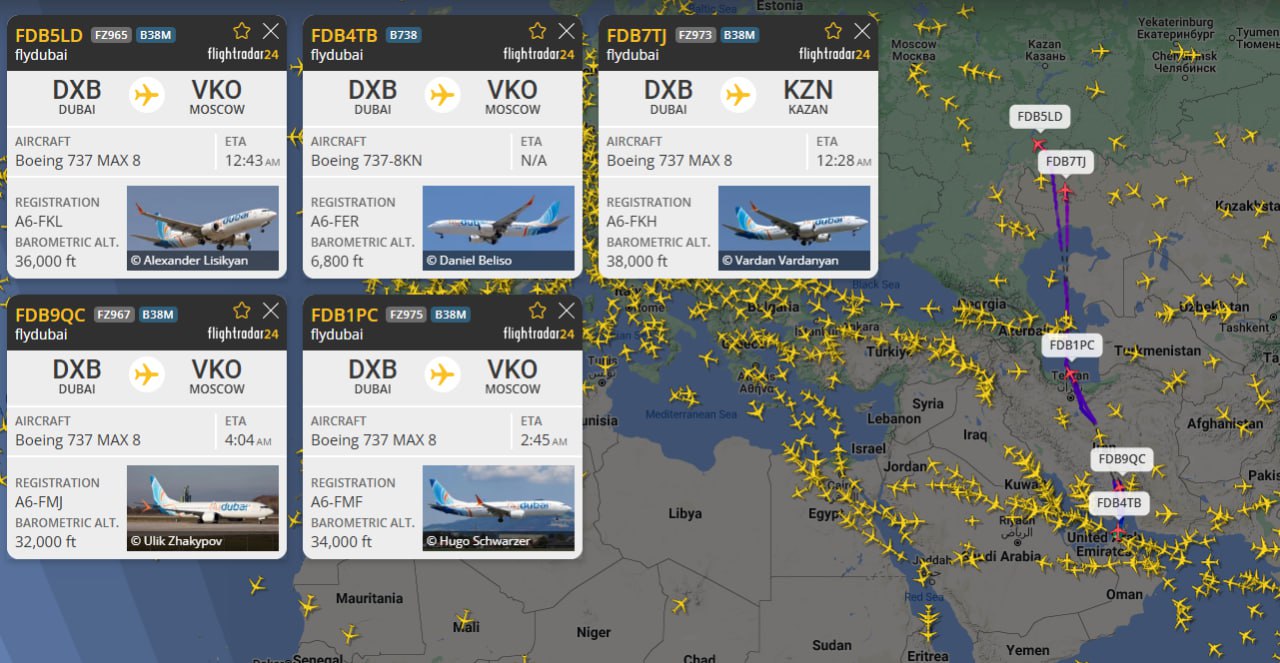 Остальные рейсы flydubai выполняются в штатном режиме: в Москву помимо FZ987 летят ещё три: FZ965, FZ967, FZ975. В Казань направляется FZ973.
