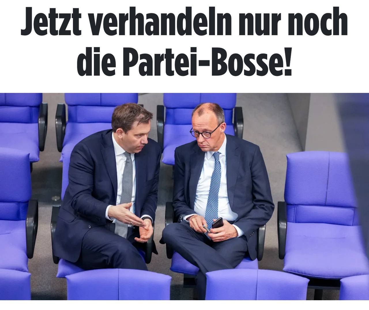 Финиш. 19 главных переговорщиков закончили свои переговоры. С позднего вечера только четыре лидера партии сидят вместе: лидер ХДС Фридрих Мерц (69), лидер ХСС Маркус Сёдер (58), два лидера СДП Саския Эскен (63) и Ларс Клингбейль (47). По информации Бильд. https://t.me/dr_alex_sosnowski