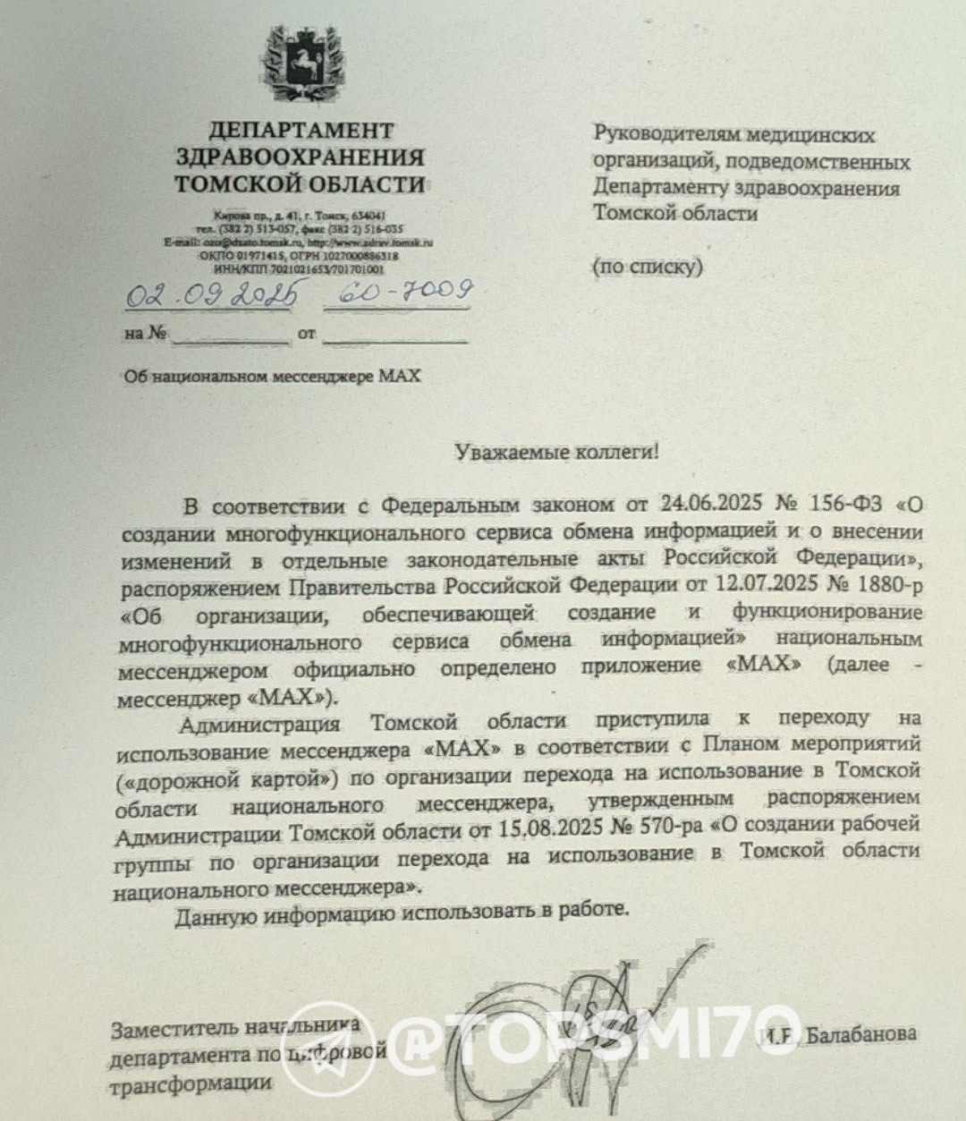 Медицинские работники переходят на использование мессенджера Max. Об этом сообщает источник канала «Новости Томска и Области». По информации источника, в департамент здравоохранения поступило распоряжение о переходе на национальный мессенджер. Аналогичное указание получили руководители всех медицинских организаций региона.