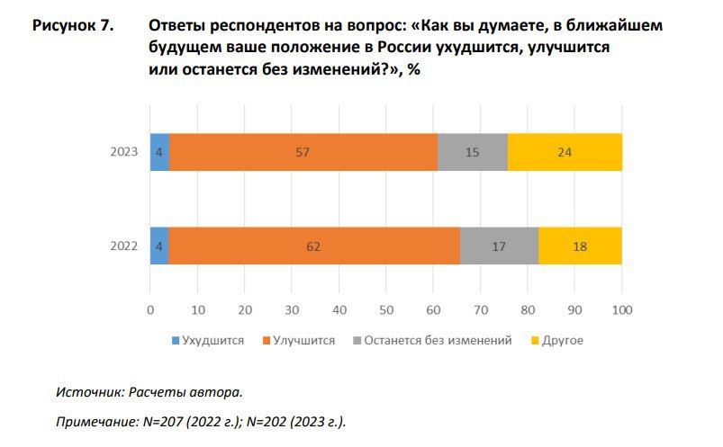 «Большинство опрошенных трудовых мигрантов довольно оптимистично оценивают своё нынешнее положение на рынке труда в России и последствия для себя экономических изменений, вызванных событиями февраля 2022 г. Так, 63% в 2022 г. и 71% в 2023 г. не заметили никаких последствий произошедшего для своего положения в России.