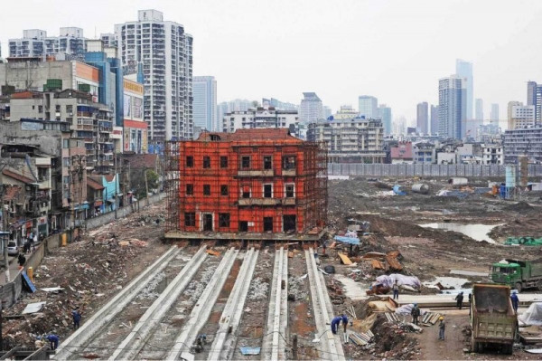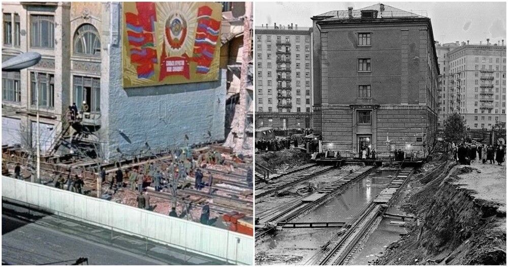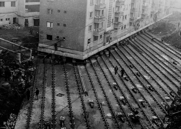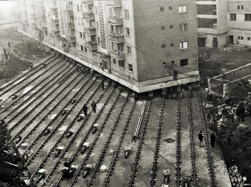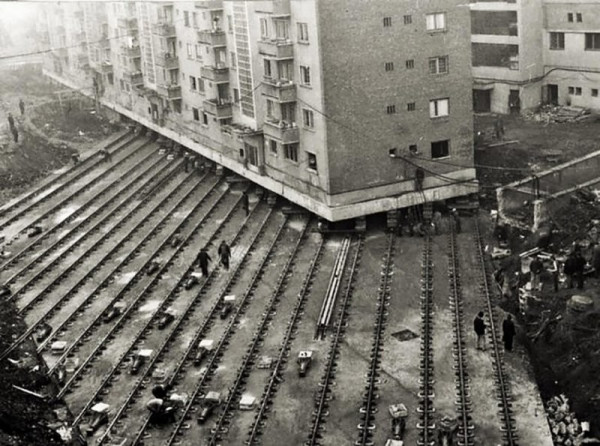 Придумали это совсем не в Союзе, первым целое здание передвинул ещё Аристотель Фиораванти, который когда-то строил Успенский собор Московского Кремля. В 1455 году один мастер из Болоньи передвинул каменную колокольню на десятки метров, воспользовавшись деревянными брусками и приподняв её. Множество лошадей тянули колокольню. Доподлинно неизвестно, кто именно первым придумал сделать что-то подобное, но креативность подхода похожа на древнеегипетскую, которые уже в то время были выдающимися строителями.