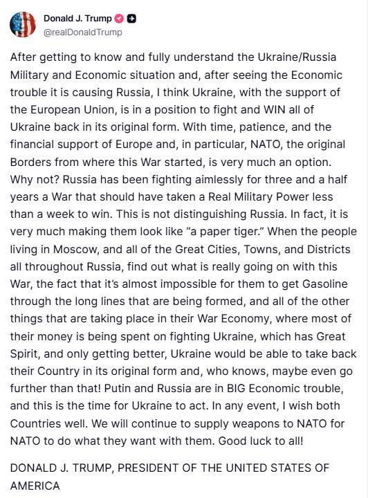 Путин и Россия находятся в серьёзных экономических трудностях, и сейчас время действовать для Украины. В любом случае я желаю обоим странам всего наилучшего. Мы продолжим поставлять оружие НАТО, чтобы НАТО использовало его по своему усмотрению. Удачи всем!».