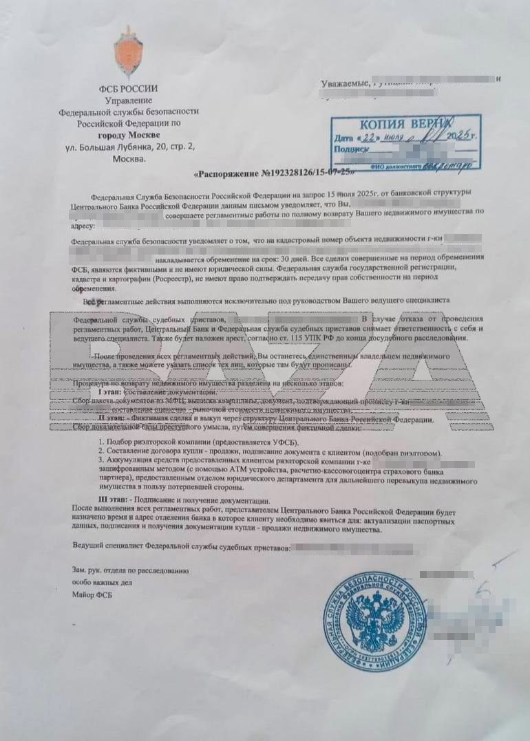 В начале июня «оперуполномоченный» решил втянуть пенсионеров в операцию по задержанию всей «преступной группировки». Для этого им нужно было продать собственную квартиру, чтобы силовики поймали бандитов с поличным. При этом их убедили, что квартира уже находится на торгах и в любой момент её могут продать, а также прислали «распоряжение ФСБ», где было указано, что «все сделки на период обременения ФСБ являются фиктивными» (на фото). Пенсионеры согласились, собрали все документы, после чего с ними связался риелтор, контакт которого дал «оперуполномоченный». Жильё продали. Наталья получила 16,7 млн рублей. Деньги нужно было передать «инкассатору», который должен был предъявить документы и назвать пароль. Услышав его, женщина отдала всю наличку.