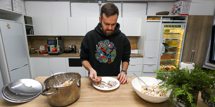 Дегустатор №1: «Сюда бы колбасу из второго салата — было бы идеально. То, что лука нет, — это всегда плюс. Визуально нет никаких различий. Этот салат мне понравился больше».