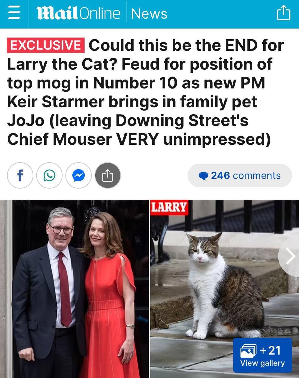 Котик уже пережил 6 лидеров страны, но проблема в том, что у нового премьер-министра, Кира Стармера, есть своя кошка Жожо.