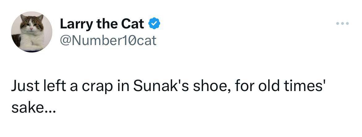 А буквально недавно Ларри нагадил экс-премьер-министру Риши Сунаки в ботинок, о чем незамедлительно сообщил в Хвиттер: