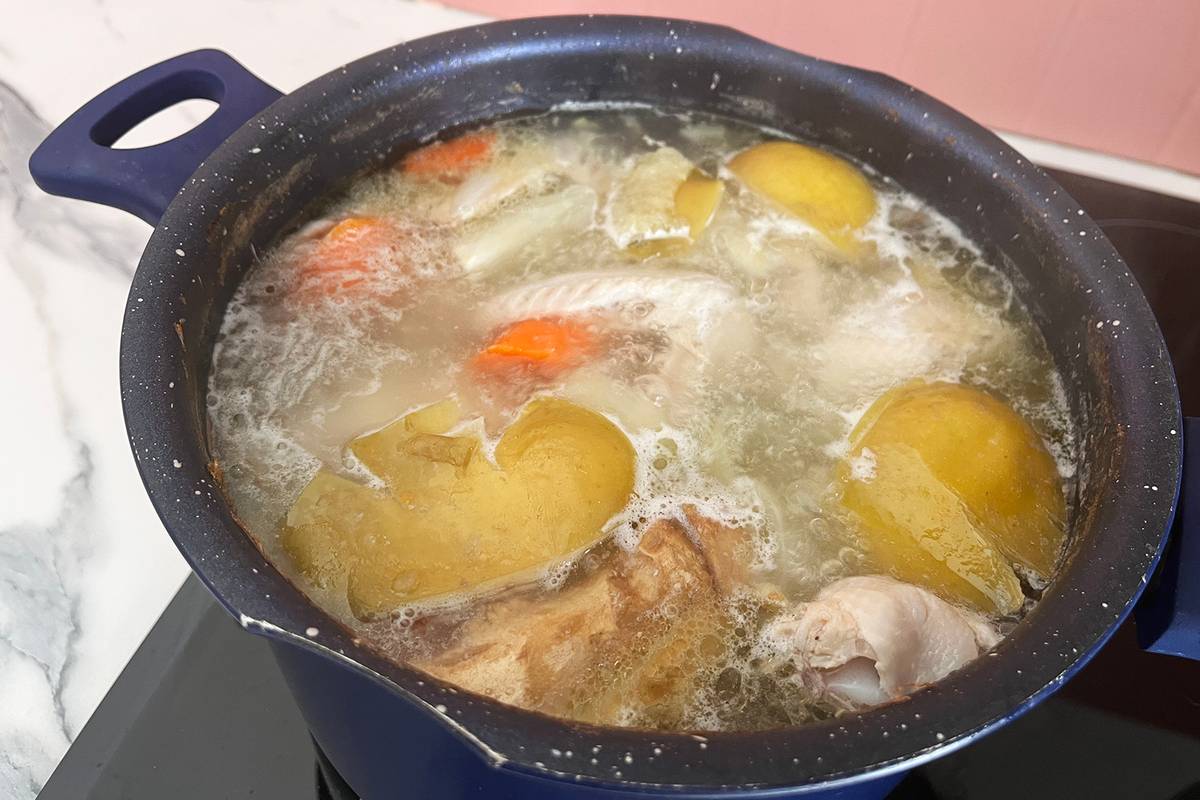 Шаг 1. Сложите крылья и голени для бульона в кастрюлю, залейте водой и поставьте на сильный огонь.