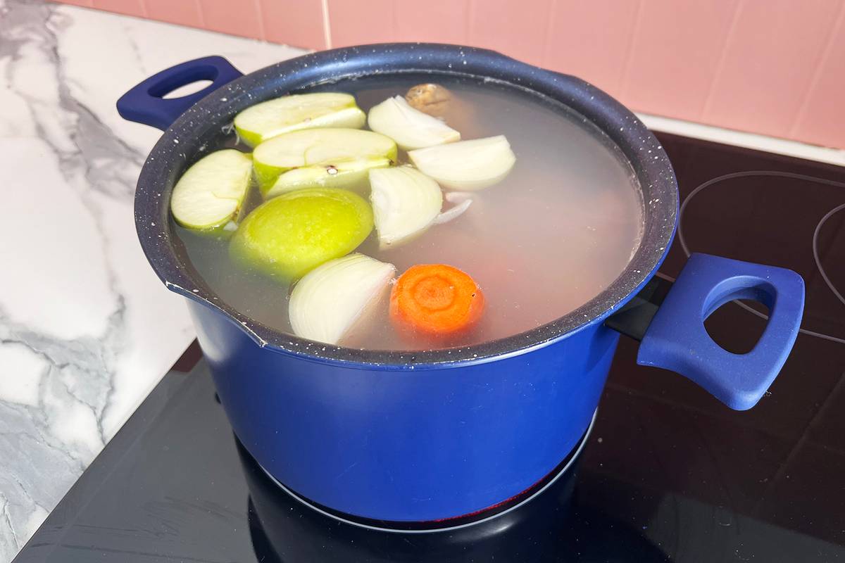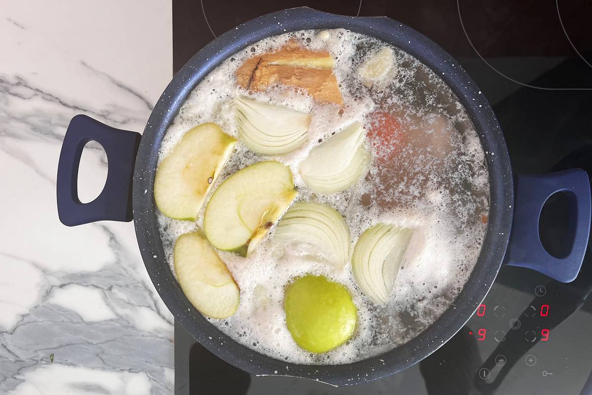 Шаг 6. Вернемся к бульону. Прошло два часа, бульон сварился. Теперь нужно его отфильтровать, потому что яблоко и лук разварились, мясо тоже. Я использую крупное сито: оно выловит большие куски, мне этого достаточно. Если нужен более чистый бульон, процедите его через марлю — так уйдут даже мелкие частицы.