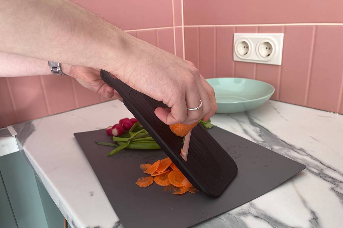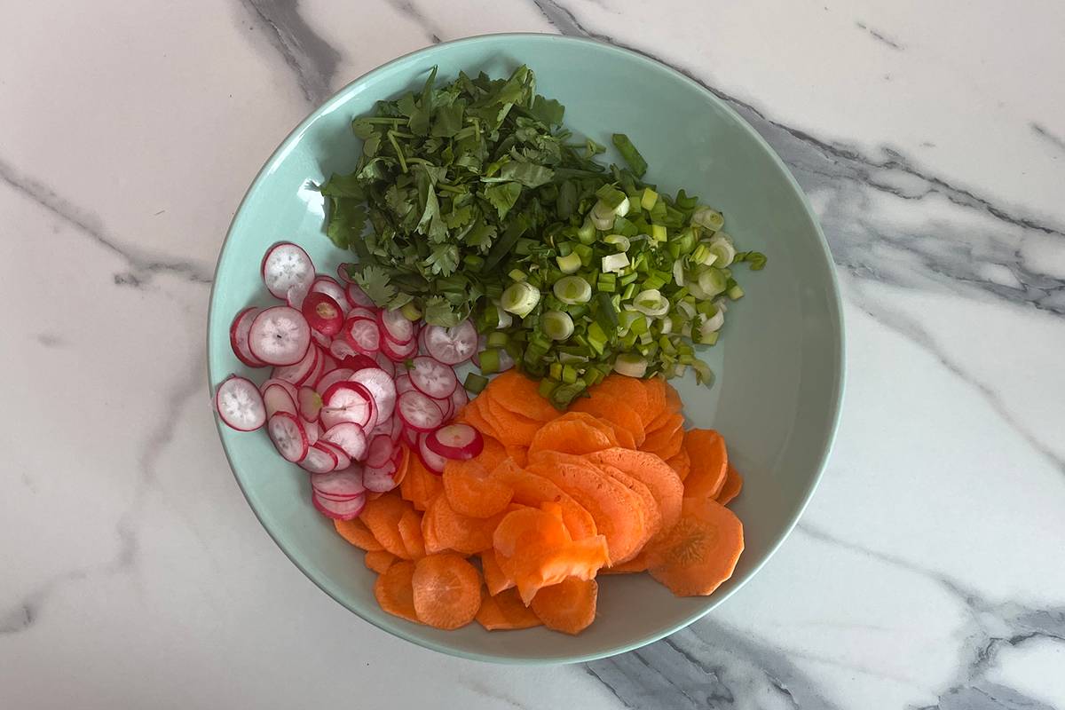 Морковь и редис я натираю на слайсере, выбираю самый тонкий вариант. Так овощи быстро пропитаются бульоном. Но можно все порезать ножом. Кинзу и петрушку режу крупно. После нарезки кладу все в одну тарелку, чтобы овощи и зелень были под рукой во время сервировки. Накрываю ее пленкой и убираю в холодильник.