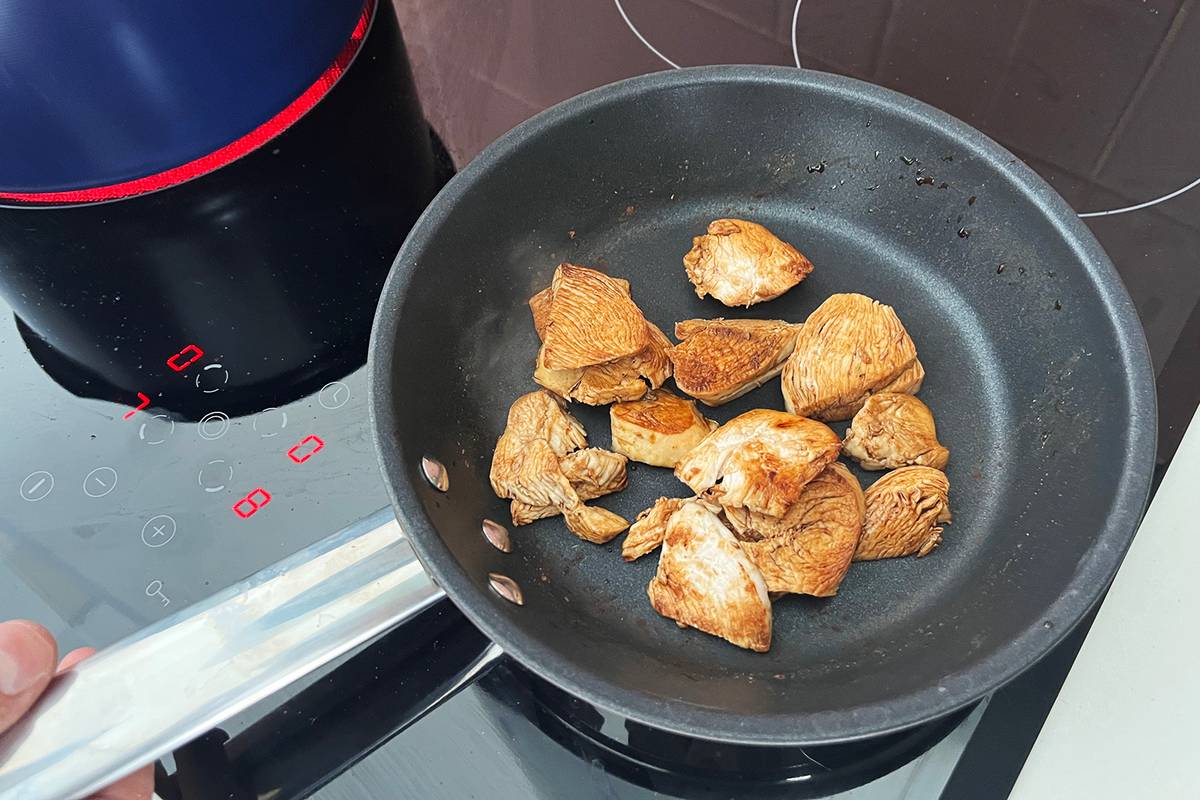 Пока кунжут жарится, порежьте куриную грудку на куски толщиной 5 мм. В ту же сковороду, где прогревали кунжут, добавьте немного соевого соуса, выложите туда грудку. Обжарьте минуту.