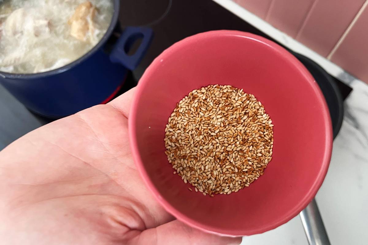 Процеженный бульон можно снова разогреть, пока поджариваются кунжут и грудка. Заодно поставьте воду для лапши.