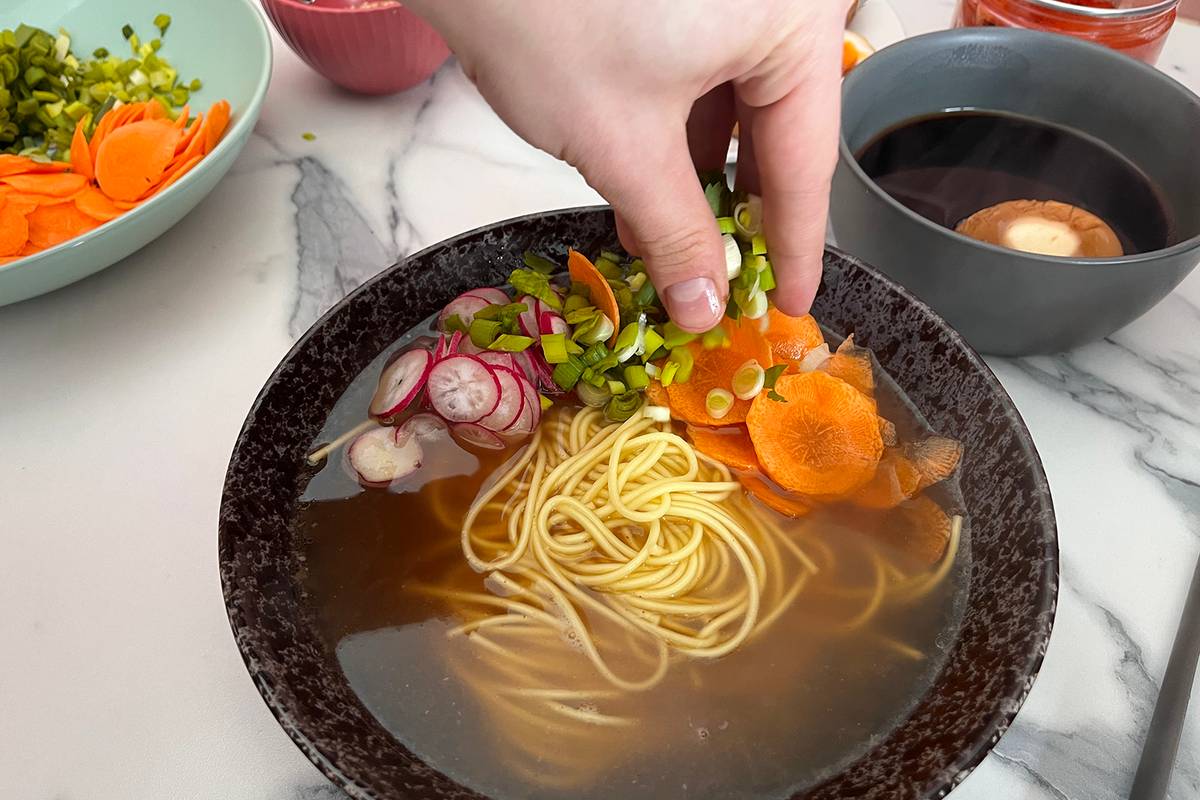 Рамен едят горячим — важно подготовить топинги заранее и сложить в одном месте. Когда бульон будет готов, нужно быстро собрать и подать суп. Я все нарезаю и складываю горками в большую тарелку.
