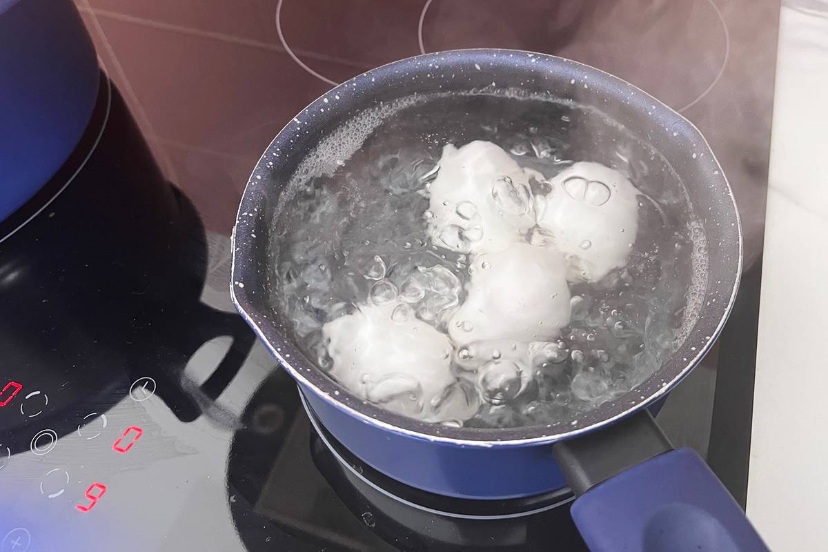 Воду в ковшике доведите до сильного кипения. Положите яйца и поставьте таймер. Когда время выйдет, залейте холодной водой и остудите. Если боитесь, что яйца лопнут, перед готовкой сделайте ножом маленькие дырочки в скорлупе.