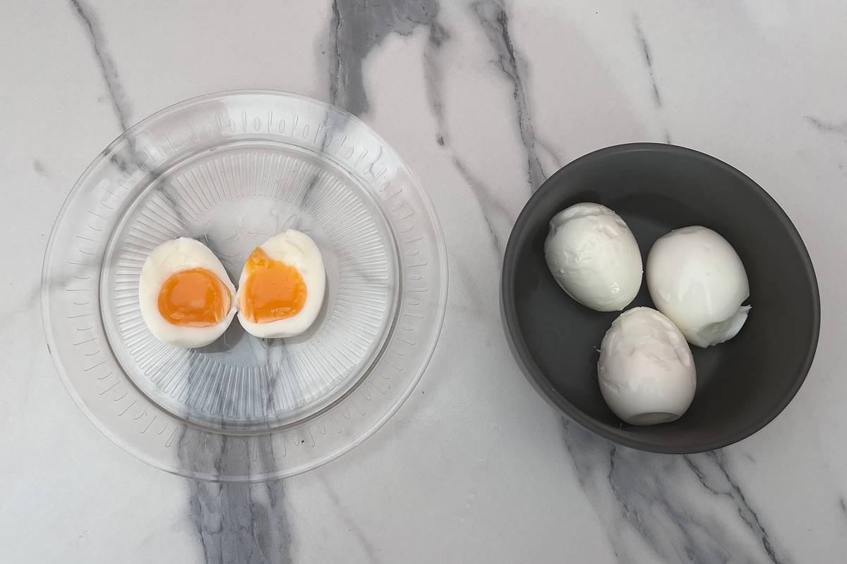 Яйца нужно сварить так, чтобы белок свернулся, а желток остался жидким. Для этого важно точно отмерить время варки. Если яйца крупные, C0 или CB, достаточно 7 минут. Если поменьше, например С1 или С2, — 6 минут или даже меньше. Я варил ровно 6 минут.