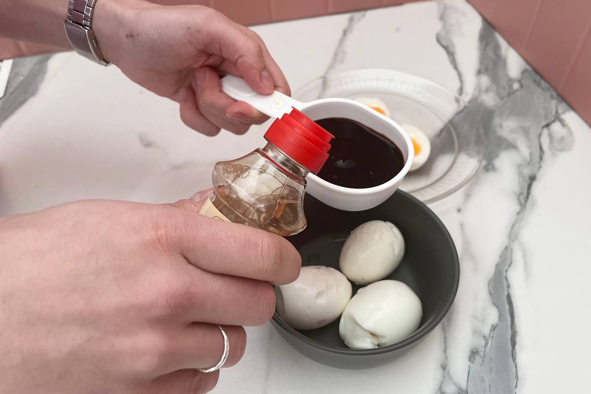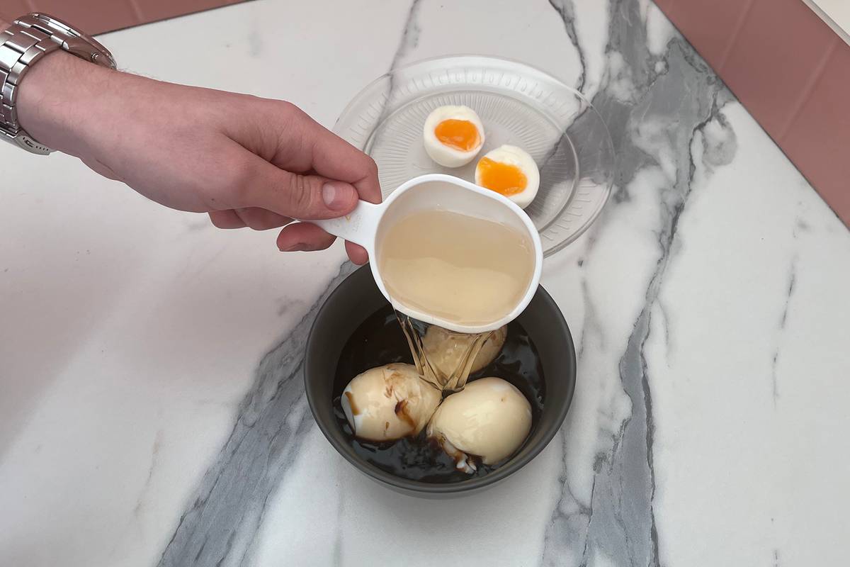Остывшие яйца очистите — только аккуратно, они мягкие — и положите в миску. Налейте полстакана соевого соуса и полстакана воды. Накройте миску пленкой и уберите в холодильник до подачи.