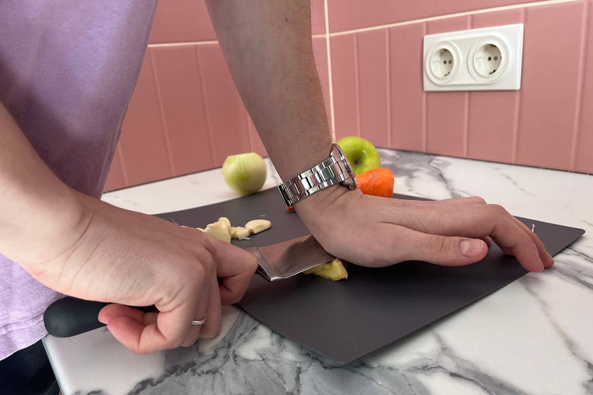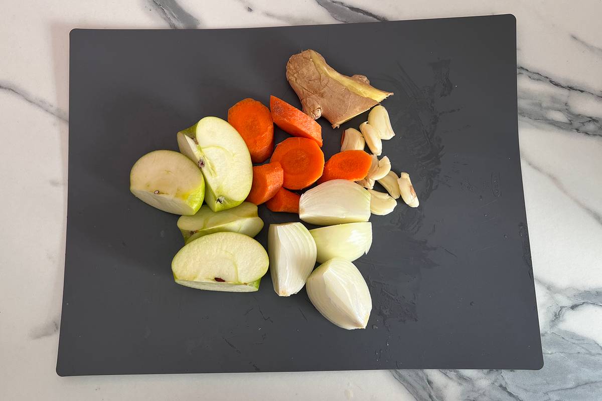 Яблоко порежьте на дольки, морковь и лук очистите и порубите на крупные куски. Чеснок очистите, раздавите дольки ножом. Имбирь тоже раздавите, его можно не чистить. Важно не резать, а именно давить: так выйдет больше сока во время готовки.