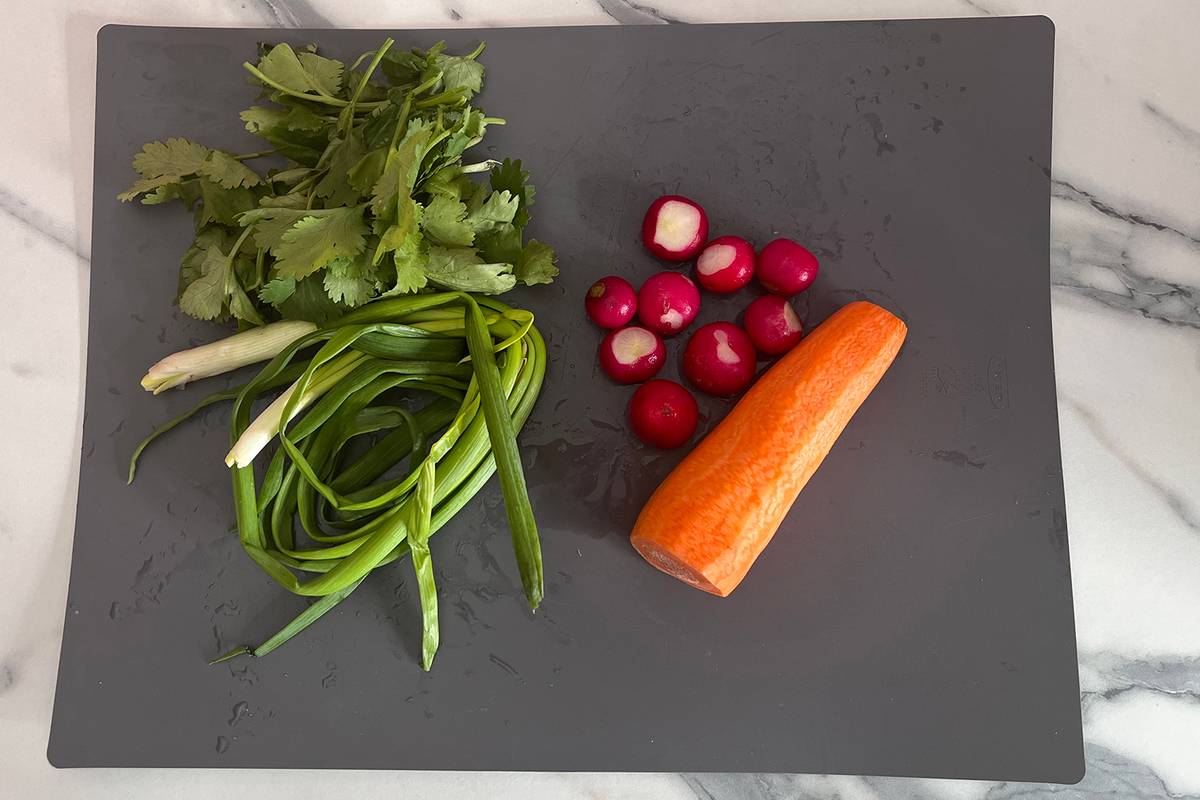 Шаг 6. Нарежьте начинку для рамена. В моем варианте это морковь, редис, петрушка и кинза. Плюс куриная грудка и яйцо, но они уже почти готовы.