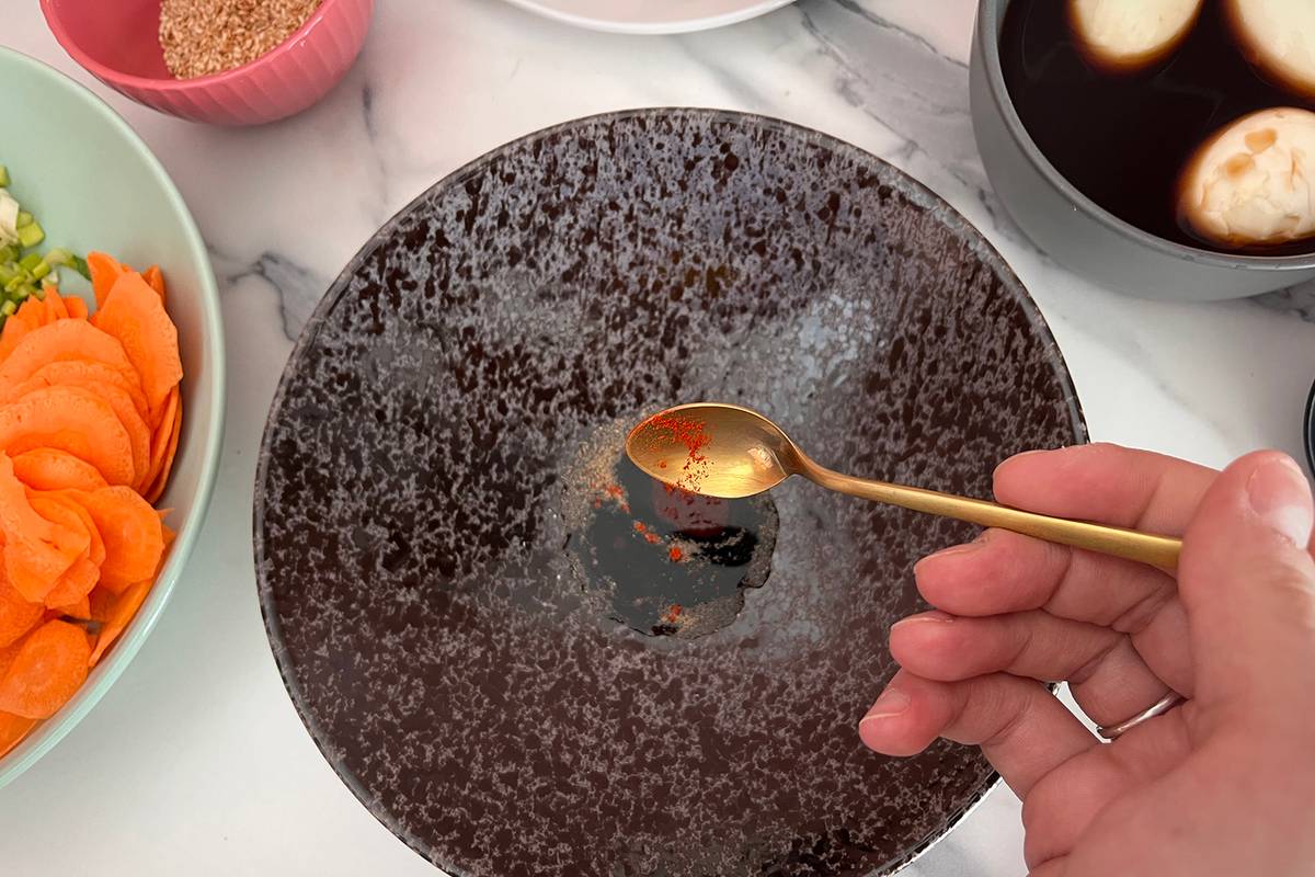 Сначала смешайте в тарелке аналог тарэ — соленого соуса для бульона: столовую ложку соевого соуса, щепотку перца и соли, половину чайной ложки копченой паприки.
