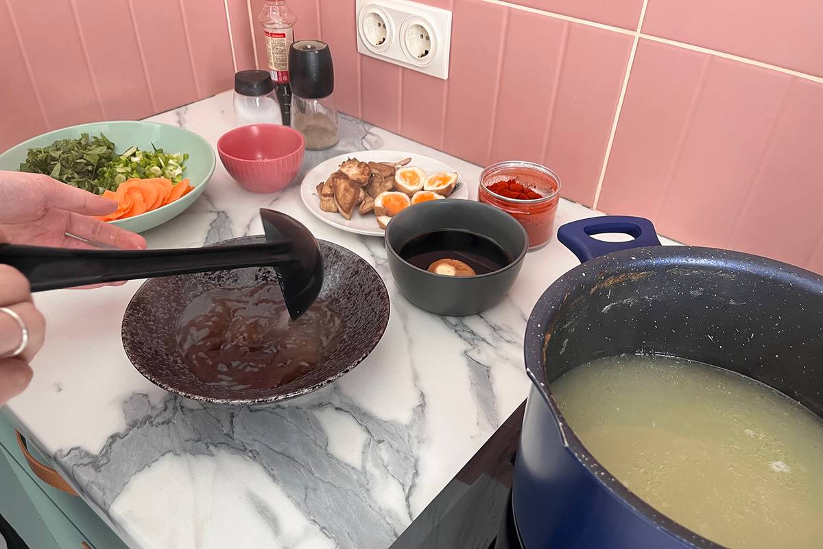 Я остановился на версии с куриным бульоном, потому что ее можно приготовить за пару часов. Тарэ — соленую заправку для бульона с соевым соусом — придумал свой, а лапшу, как правило, покупаю, а не вытягиваю вручную. С начинками тоже импровизирую, обычно добавляю побольше овощей и зелени.