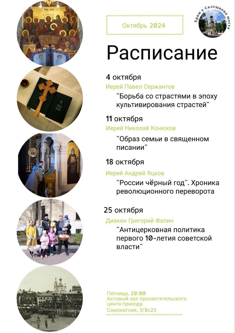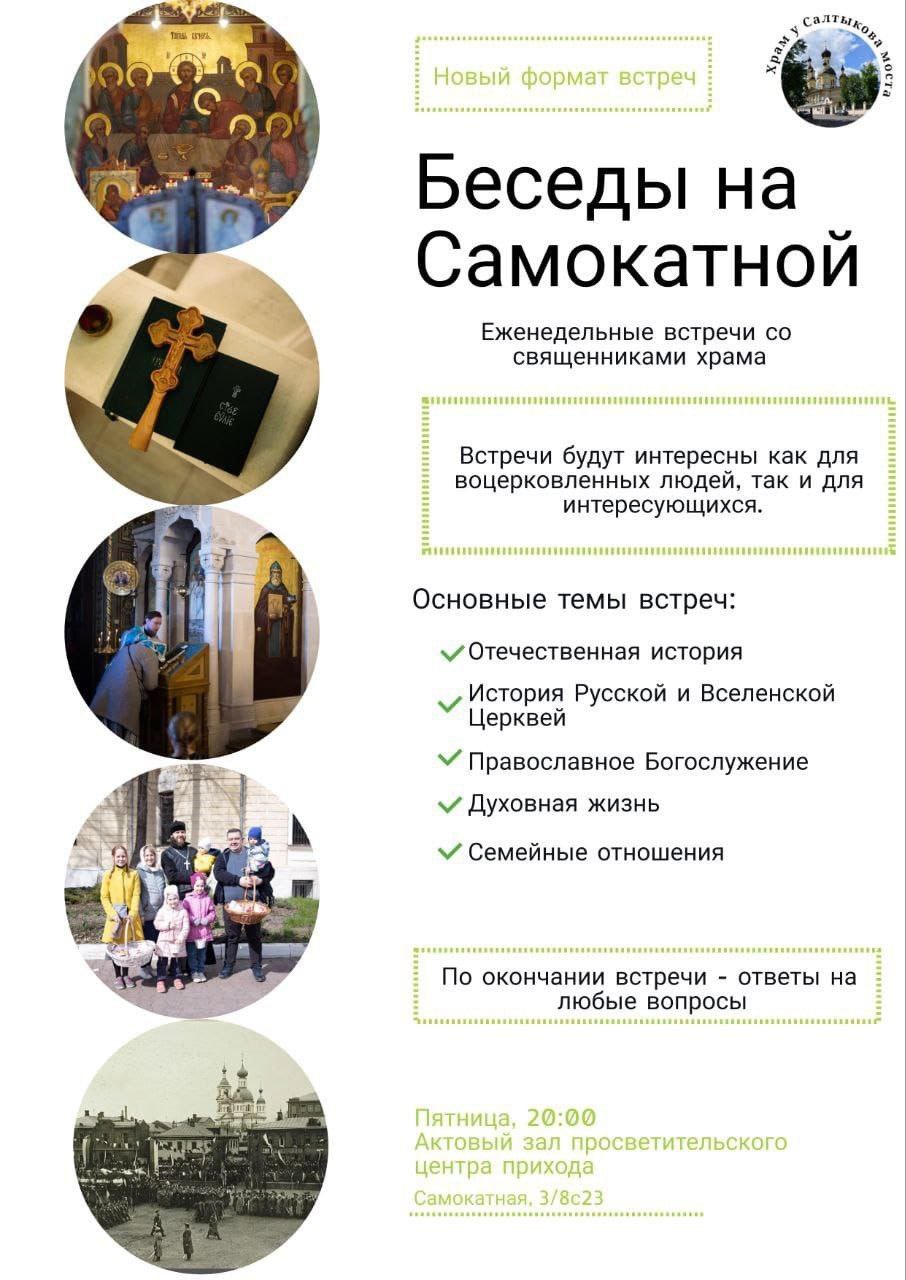В Просветительском центре при храме Живоначальной Троицы у Салтыкова моста по пятницам в 20:00 проходят встречи с духовенством храма.