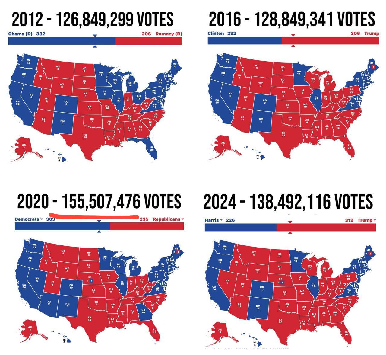 ⚡️На прошлых президентских выборах в США внезапно оказалось на 27 миллионов больше избирателей, чем на позапрошлых. И на 17 миллионов больше, чем на нынешних.
