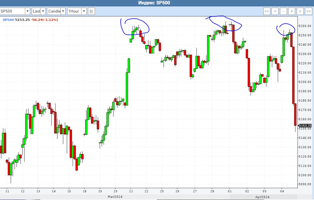 Интересный день в четверг был по индексу SP500. Была попытка вернуться на исторические максимумы, но потом пошел резкий слив и цена ушла на минимумы за две недели.