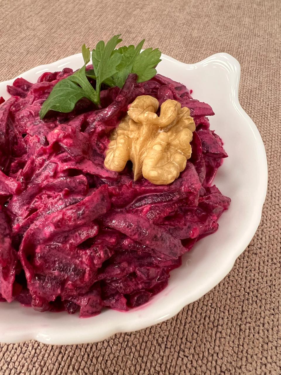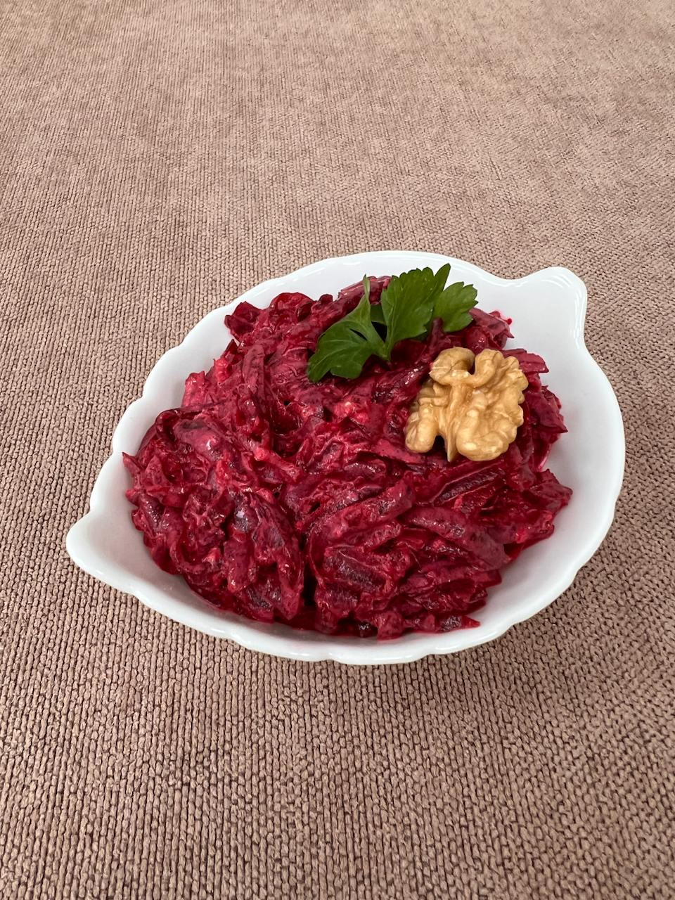 Здесь запеченная свёкла, зубчик чеснока (через пресс), через тот же пресс - грецкие орешки, по вкусу соль и майонез.