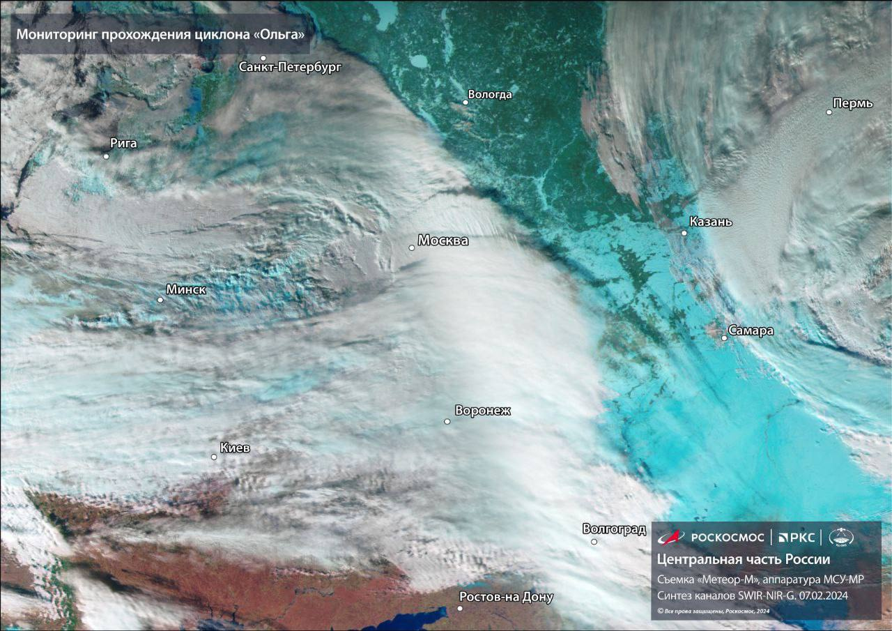 «Роскосмос» показал мощный циклон «Ольга», который накануне обрушился на Екатеринбург. Он принес с собой снегопады и сильный ветер.