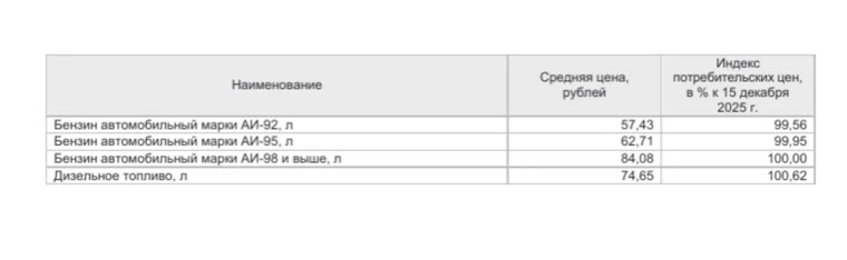 «Средние потребительские цены на отдельные товары и их изменение на 22 декабря 2025 года в Курганской области. Бензин автомобильной марки АИ-92 подешевел на 0,44%% (средняя цена — 57,43 руб), марки АИ-95 подешевел на 0,05% (средняя цена — 62,71 руб). Без изменений бензин марки АИ-98 (средняя цена — 84,08 руб). Дизельной топливо подорожало на 0,62% (средняя цена — 74,65 руб)», — передает Свердловскстат.