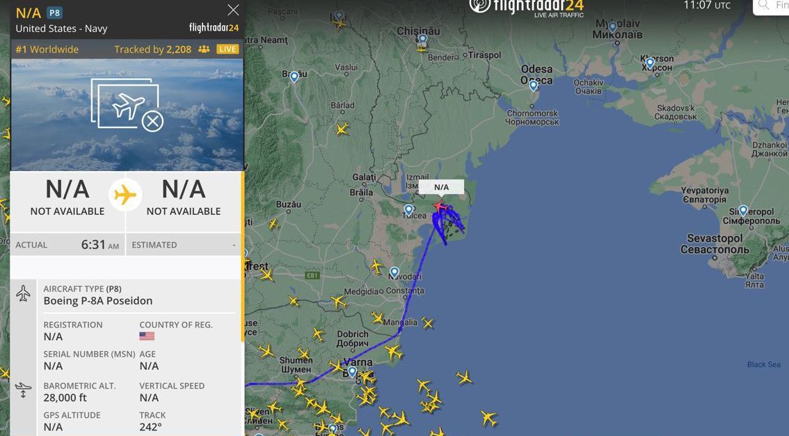 Во время ракетной атаки по Севастополю в небо над Чёрным морем поднялся разведывательный Boeing P-8A "Посейдон" ВМС США. Сейчас он по-прежнему в воздухе. Предположительно, самолёт координировал действия ВСУ.