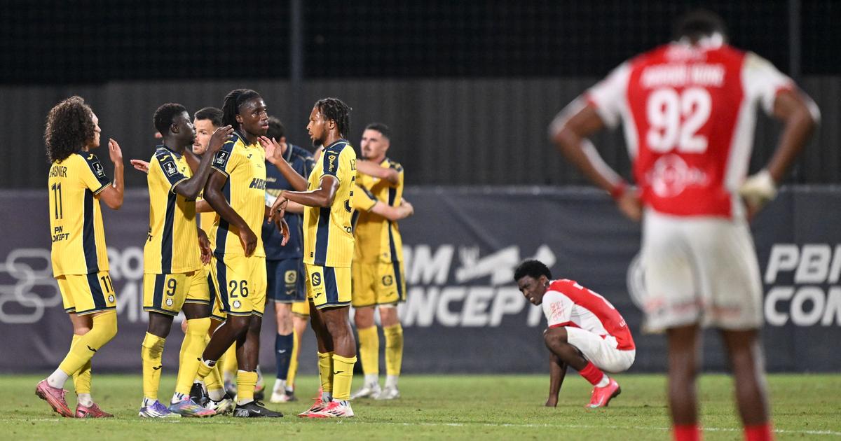 Dans un début de match plutôt de bonne facture, les Champenois ont concédé le premier but sur un corner conclu par le capitaine palois Jean Ruiz qui a catapulté la balle, d'une tête bien décroisée, dans la cage (18e). Gagnée par la fébrilité la défense rouge et blanche a de nouveau pris la marée, surprise par un long ballon en chandelle récupéré dans le coeur du jeu. Après un double raté de Hiroki Sikine et Jordan Siebatcheu, le virevoltant Omar Sissoko n'a pas raté l'aubaine pour faire le break (26e).