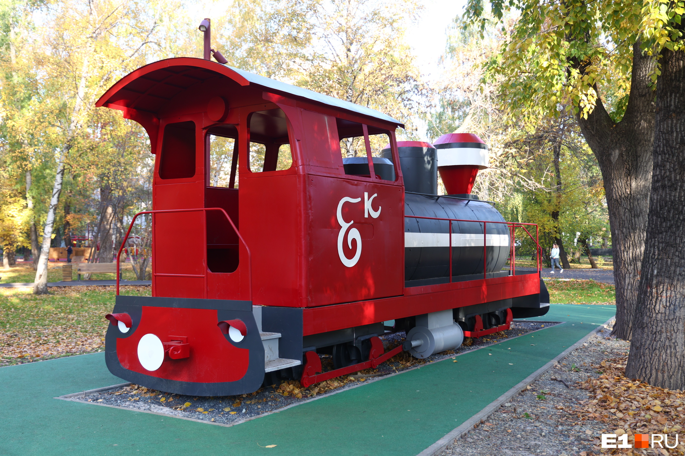 Символ парка — детский паровоз. Его сохранили, покрасили и добавили букву Е.