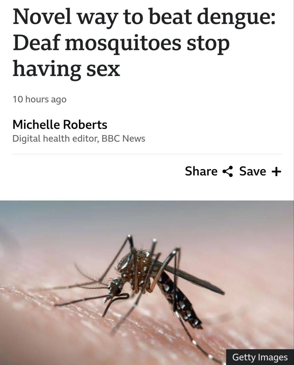 Прикол в том, что комары спариваются в воздухе и самцы ориентируется на звук крыльев самки. Учёные генетически подрезали комарам слух — и те вообще перестали пытаться создать потомство. Исследователи надеются, что это поможет в борьбе с болезнями вроде лихорадки Денге и т.п.