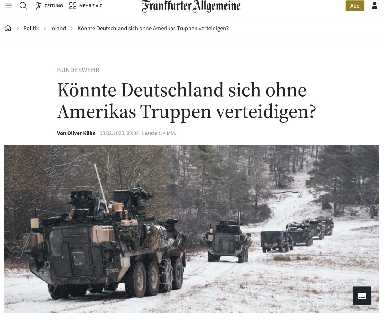 Бундесвер в критическом состоянии – Германия остаётся зависимой от США. Германия не способна защитить себя самостоятельно. Она полностью зависит от военного присутствия США, пишет немецкая газета FAZ.